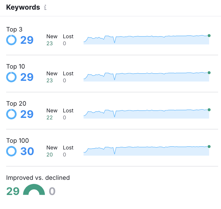 Top 10 Positions: 29 keywords (including 23 new keywords) rank within the Top 10.