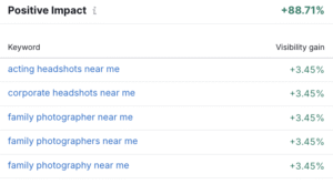 Exceptional Visibility Gain: A remarkable $+88.71\\\\%$ visibility gain was achieved, indicating a massive increase in how often the studio appears for high-intent photography searches.