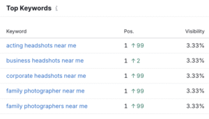 Geographic Keyword Optimization: A targeted focus on high-intent, location-specific keywords that match the studio’s core offerings and service area. The success of terms like “acting headshots near me,” “corporate headshots near me,” “family photographer near me,” and “family photography near me” (all ranking #1) indicates a strong focus on local SEO.